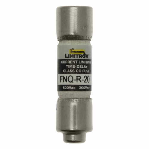 Eaton Bussmann serisi FNQ-R sigorta, Akım sınırlamalı zaman gecikmeli sigorta, 20 A, CC, Göstergesiz, Yüksük ucu x yüksük ucu, %200'de 12 sn, 300 Vdc'de 20 kAIC, 600 V'ta 200 kAIC, Melamin tüp, 600 V, 300 Vdc